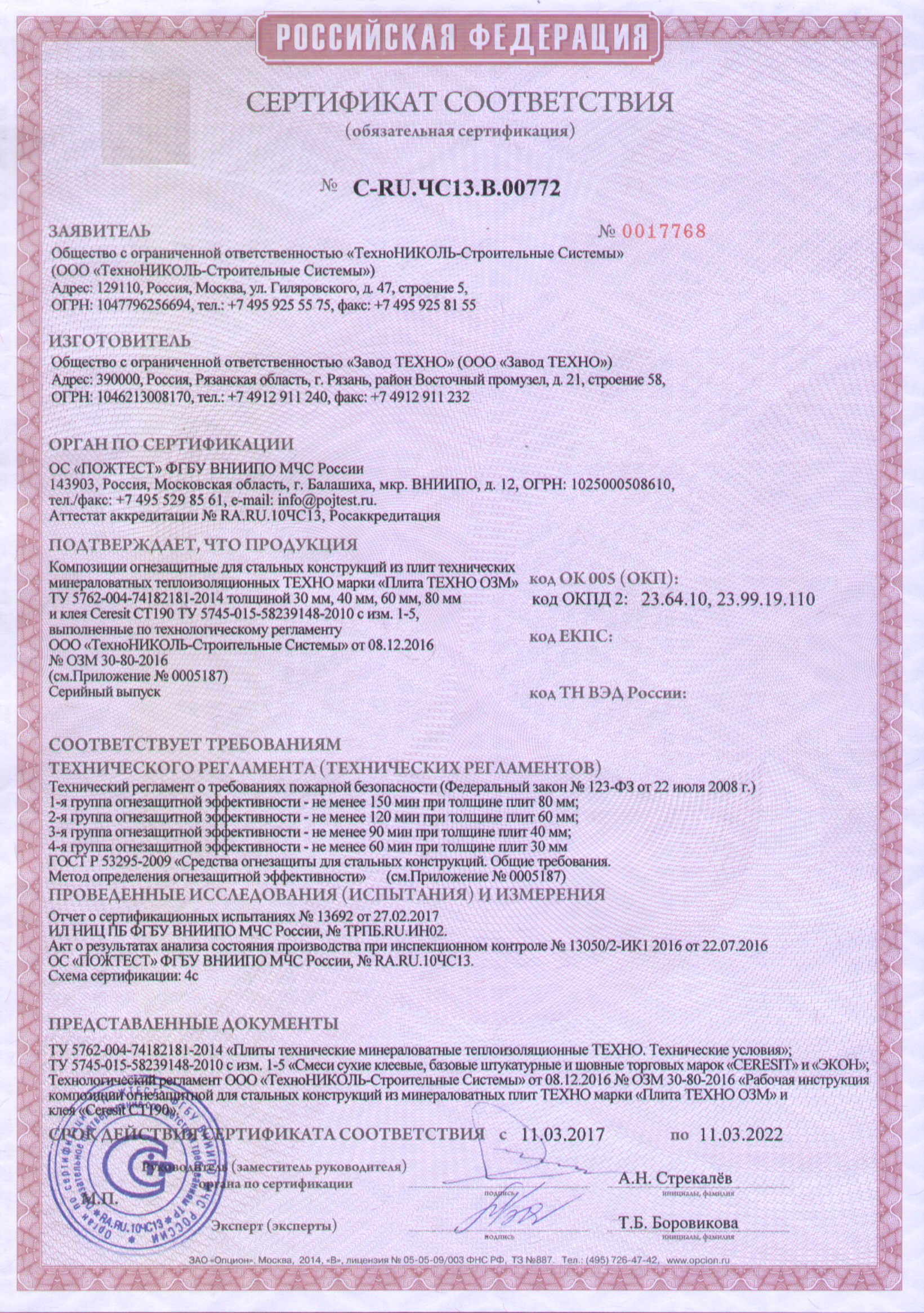 Плиты ТЕХНО ОЗМ (плиты огнезащитные для изоляции конструкции из металла ТЕХНОНИКОЛЬ) применяются в гражданском и промышленном строительстве, при новом строительстве и реконструкции зданий и сооружений различного назначения. Огнезащита стальных конструкций – основная функция материала. Помимо неё материал обеспечивает эффективную теплоизоляцию конструкций.
